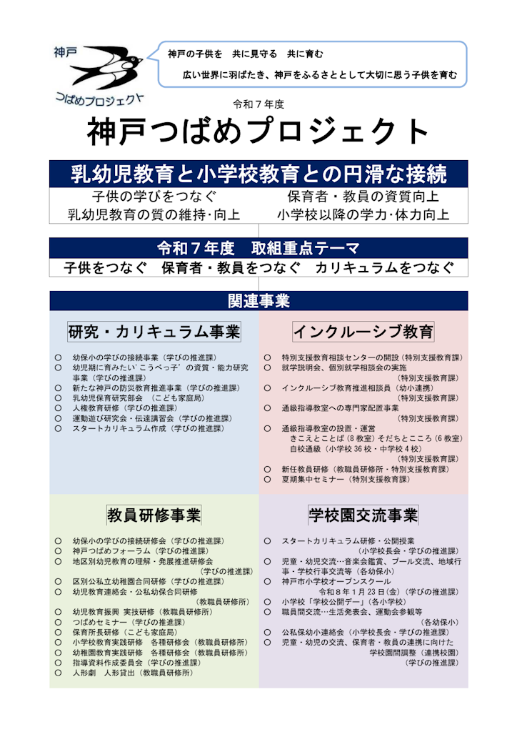 ★ プロジェクト名には、「親が世話をし、卵からひなが生まれ、育ち、大空をはばたいていく『つばめ』を子供たちの姿に重ね、家庭・地域・学校園と行政が共に見守り、育て、幼稚園・保育所・認定こども園から小学校、それ以降につながる、健全な成長への思い」が込められています。
