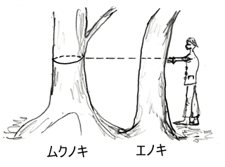 胸高周とは:地上1.3mほどの幹のまわり.左の場合,ムクノキは91cm,エノキは156cm. |