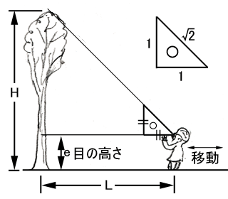 木をはかる:広い平らな境内なので測るのに都合がよい.三角定規を使って測ることもできる