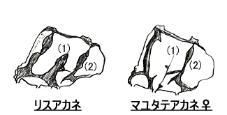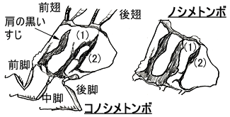 | 翅の先端に黒(茶)褐色の紋(もん)のあるアカトンボのなかまの種類の見分け方。略図で描いたように、トンボを真横から見て翅の生えている胸の側面の黒いすじ(黒条)に注目するのも一つの方法です。とくに、図上(1)(2)のすじののびぐあい、つながりなど、よく観察します。 |