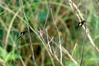 林のふちを群れ飛んでいるトンボたちをよく見かけますが、昼休みどきに見に行きますと、ちょうど雌(写真9左)、雄(写真9右)が少し離れて休んでいましたので、カメラに収めました。腰のあたり(腹部第3、4節)があざやかな黄色が雄で、雌のは黄に黒が混じっていますので区別できます。