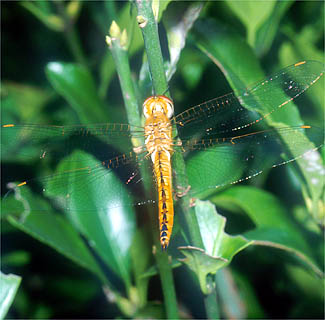 落合池をかこんでいる林のふちでオオシオカラトンボの雌が休んでいました(写真6)。体の色のぐあいから、羽化してまもない雄のこともあるのですが、腹端のようすから、この場合は雌のようです。みなさんよく知っているシオカラトンボの雌(ムギワラトンボと呼ぶことがあります)とよく似ています。オオシオカラトンボの場合は、翅のつけねのあたりが雌雄どちらも黒っぽいので区別できます。体がとくに大きいというわけでもなく、幅が少し広いようです。