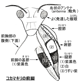 | 註:カマキリのなかまの前脚の基節は、他の昆虫とちがって大変長い。コカマキリが前脚を上げると、白黒の紋がよく見えるので、他のカマキリとまちがうことはない。 |
