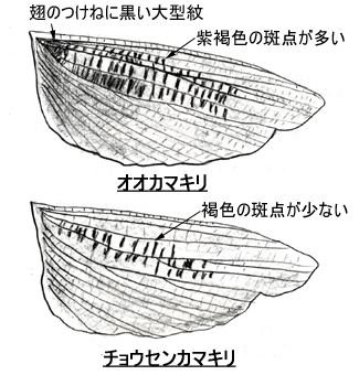 | オオカマキリとチョウセンカマキリはよく似ていますので、後の翅の短いたての斑点のようすで区別します。 |