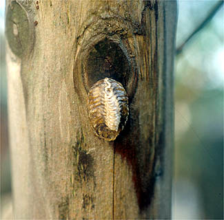 産んでいるときの卵のうの色は青粘土の色ですが、しばらくたつと褐色がかってかたくなります(写真18)。この卵のうとよく似たチョウセンカマキリのは灰色でもっと細長いので区別できます。