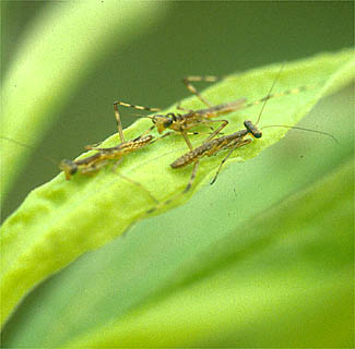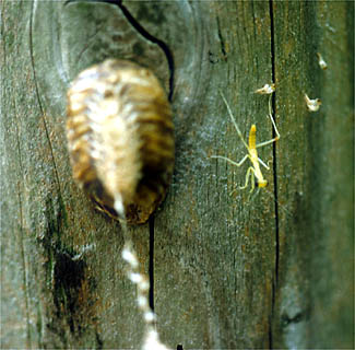 卵のうからかえったばかりのものは、体のもようもはっきりしませんが、のち、このようにしまもようが現れ、腹端を上に反らせ、小集団で行動します。どうやら、セイタカアワダチソウにつくアブラムシがめあてのようです。