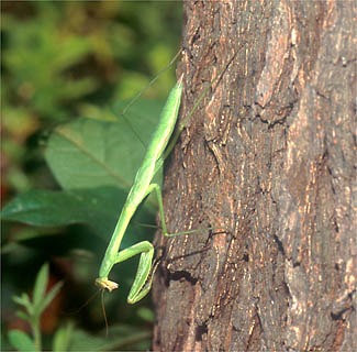 神戸の玄関ともいえる新神戸駅のすぐ南のクスノキの幹に止まっていたオオカマキリ(写真22)。ちょっと見ただけではチョウセンカマキリと区別がつかないので、つかまえて後の翅のもようを見ます。