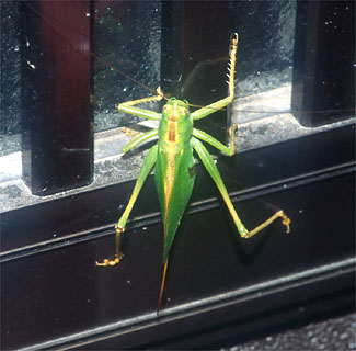 天気は快晴、朝8時、家を出て戸を閉めようとしたら、キリギリスのなかまが我が家を訪問しているのが目にとまりました。思いがけない来訪者に朝からすっかり気をよくさせてくれました(写真31)。
