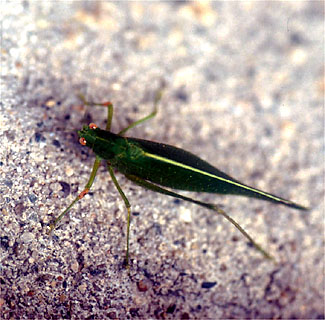 ウバメガシやイブキらの植わった民家の庭先にいたヒメクダマキモドキ、体長は2.5cm、羽の先端までなら3.8cmで体はうすい緑色、アンテナの長さは5cmでした(写真32)。前足のひざ下をよく見ますと、褐色をした聴覚器(音を受けるところ)がよく目につきました。