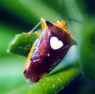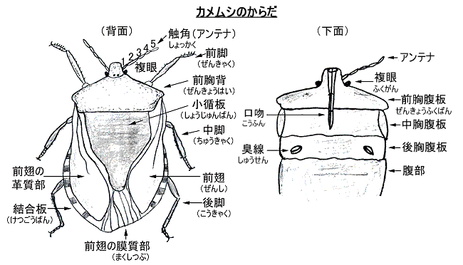 頭や背中を上から見ますと、カメの形になるカメムシのなかまは、半翅目のなかでも、前ばねのもとの方の半分が革質(かわしつ)で、半分から先の方が膜質になっています。また、胸の下には臭線(しゅうせん)といって、敵に会うと独特のくさい臭いを出すしかけを持っています。それでヘッピリムシとも呼ばれます。