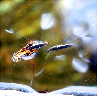 飛行力のあるアメンボは、市街地から数kmも離れたポーアイの南公園の池で50匹ほどが群れていました。その一つのグループにビロードハマキという蛾が水面に落ちていました。それを4匹が追っていましたが、やがてそれぞれが離れていきました。生き餌でないと体液を吸わないのか、なぜあきらめたのか私には分かりません(写真57)。