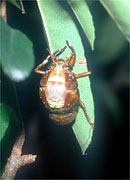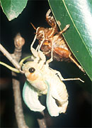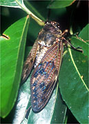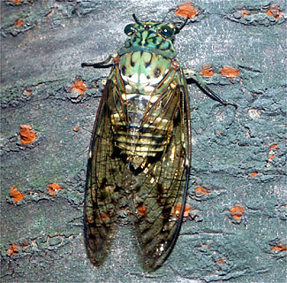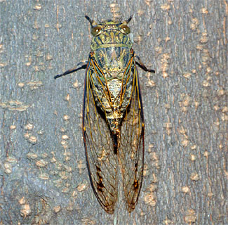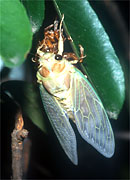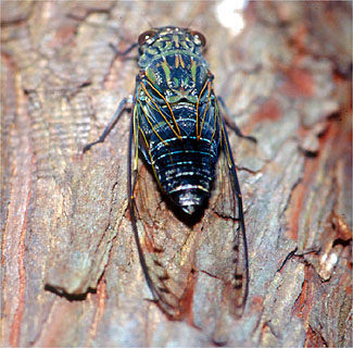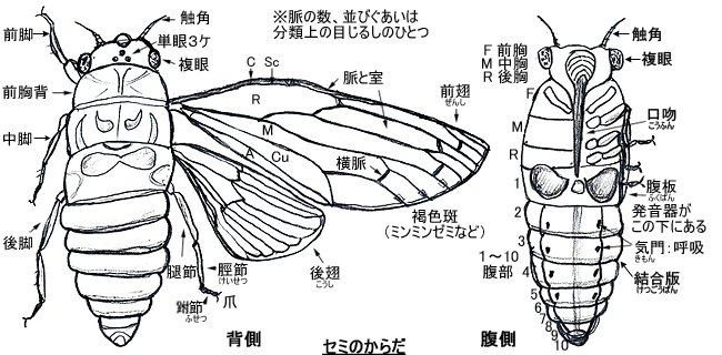 口はカメムシのなかまと同じく、パイプ型の吸収口ですが、幼虫も成虫も植物質を吸汁します。また、前後のはねは膜質で、前ばねの先の方半分だけが膜質のカメムシ類と大きく異なります。また、雄は発音筋、発振膜、そしてバイオリンの胴の役目をする大きな共鳴室など複雑なしくみで、昆虫界きっての大音響で鳴き、鳥も顔負けです。