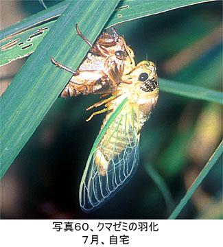 体を休めていた殻から15cmほど移動して離れていた。羽はもうすっかり親ゼミの色になっていた。あとはもう飛び立って1ヶ月ほど夏を謳歌(おうか)するのみ(写真65)。 |