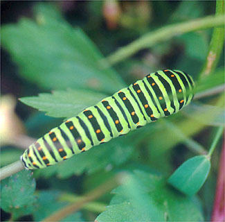 5令(終令)の幼虫は、説明の必要がないほど鮮やかな色どりですが、これより若いものは、他のアゲハのなかまと同じ、黒っぽい体をしています(写真116)。食べているのは、水辺に生えるセリです。