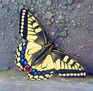このチョウなら、だれでもおぼえがあるでしょう(写真121)。神戸で見られるアゲハチョウ科のなかまは、加藤昌宏先生によりますと11種あるそうですが、名のとおりのはねの模様は、ほかのアゲハと見誤ることはありません。