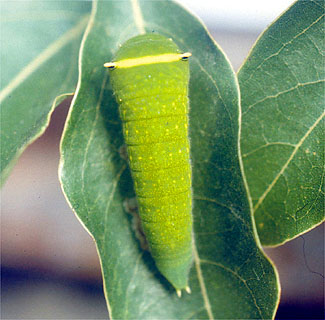 黒褐色の体に白い紋が3カ所で、鳥糞状に見えるのが4令までの幼虫で、4回目の脱皮を終えると緑色に変身して、5令を迎えます。
