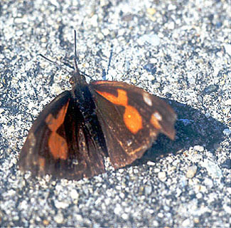 歩道に座り込んだテングチョウ(写真134)。前のはねの先が独特です。口元の下から太いひげが一対長く伸びて天狗(てんぐ)の鼻のようです。