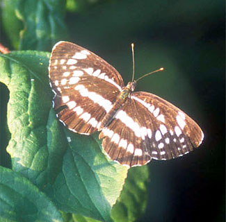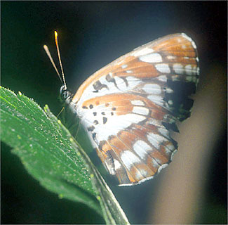 はねの裏側のつけねの模様をよく見ましょう(写真141)。白い部分に黒い紋が点々とついていますので、ほかのミスジチョウのなかまと区別できます。