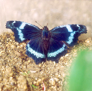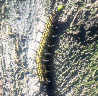 胴体の各節から肉質突起を出した終令幼虫が、食草としていた公園のエノキから緑色の糞を出しながら、幹を下りていました(写真147)。チョウになると、後ろばねの裏に黒いやや大きな紋が一ヶ所ついています。