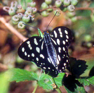 黒っぽいはねに、白い大粒のゴマをまぶしたよう(写真149)。幼虫の食草はオオムラサキと同じエノキです。ここはウツギが生えているくらいですから、住宅地としては山がかったところ。