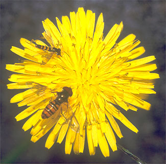 セイヨウタンポポの花に、ちょうど2種類の小型のアブが来ていました(写真154)。体の太さと、背のしま模様などは違いがはっきりしますが、体長はいずれも1cmほどです。