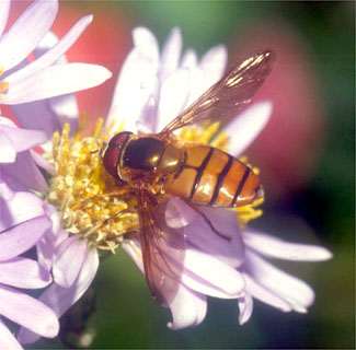 庭のシオン(キク科)の花に来ていたヒラタアブの一種、体長は1.5cmと中型のアブです(写真155)。