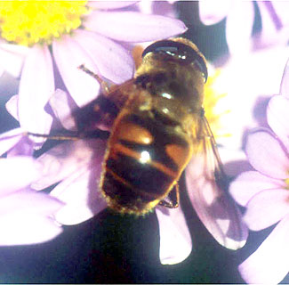 成虫はよく花にやってきますが、幼虫は長い呼吸管を持ち、汚れた水の中で生活します。