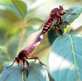 体は2.5cm前後と大きく、つめを持った頑丈な脚をそなえ、ほかの昆虫を狩る肉食性のアブです(写真157)。