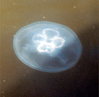 ミズクラゲは子孫をふやす器官(生殖腺)が4つにさけて見えますので、ヨツメクラゲともいいます(写真510)。