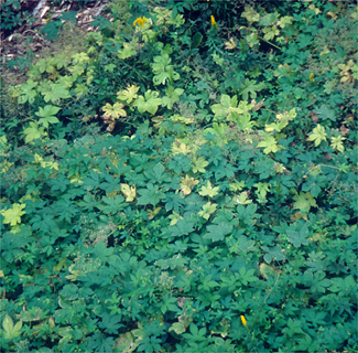 中州で広がるクワ科のつる植物で、雌雄異株(しゆういしゅ、お花、め花は別々の株)の一年草です(写真540)。こんなのが多年草で毎年居座られたら下草は助かりません。