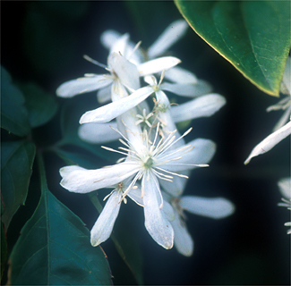 葉の柄が他のものに触れるとそれをからめて立ち昇る一種のつる植物です。花びらはなく、そのように見えるのは「がく」で4枚です。
