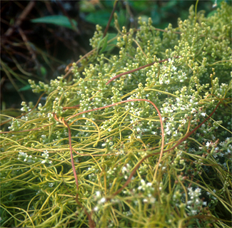 中州のヨモギなどの草におおいかぶさって養分を横取りする寄生植物です(写真542)。つるはソバぐらいの太さで小さな吸盤があります。