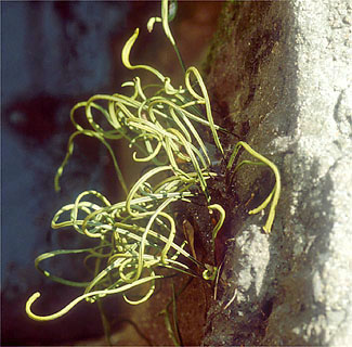 フサシダ科に属し、シダでは珍しくつる性で、別の名はツルシノブです(写真358)。つるのように見えるのは、葉の中軸が間延(まのび)したもので、茎そのものではありません。