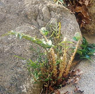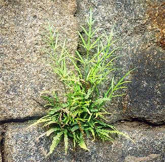 人里はもちろん、都会でもよく見る小型のシダで、チャセンシダ科のひとつ(写真353)。