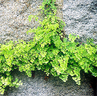 さきのタチシノブと同じく、葉の美しいなかまの多いホウライシダ科のひとつで、ふつうアジアンタム(adiantum)の名で知られています(写真356)。天然のものだけでなく、数えきれないほどの園芸種があるそうです。