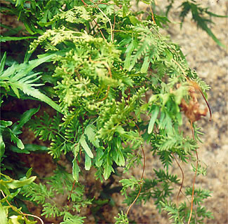 人里から山のふもとにかけ、よく見られるホウライシダ科の一種で、ニンジンの葉を思わせます(写真355)。中央の軸から3,4回、大から小へと裂けて1枚の葉となっています。