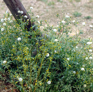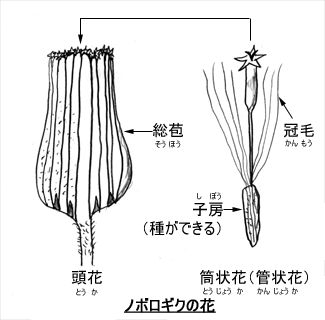ノボロギク(写真30)は,公園の植木の根もとに群がって生えています.花は黄色で.タンポポより小さい綿ぼうしをのせていますが,頭状花をつくっている小さな花はタンポポとは全くちがう筒状花の集まりです.図を見ましょう.タンポポのような舌状花はありません.