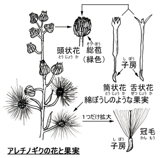 頭状花は直径5mmほど.とても小さな花がぎっしりつまっています.果実は綿ぼうしのようで,直径1cmほど.汚れた感じの白い色をしています.冠毛の中心の濃く描いたところは舌状花です.子房(種子になる)は大げさに描くと少しひん曲がっています.冠毛をつけたパラシュート状の果実は,冠毛が約3mm,子房が約1mmの大きさです.舌状花と筒状花は冠毛を省略して描いています.花のつきかたは総状花序と言われます. |
