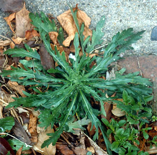 アレチノギクのロゼット葉(写真35)には,花の芽を用意した茎がうずくまっています.まもなく立ち上がって花をつけることでしょう.