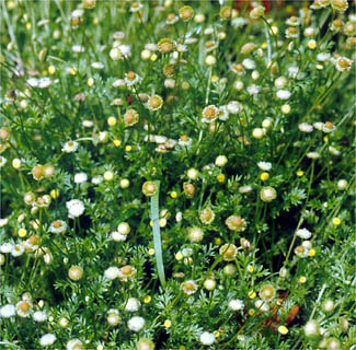 マメカミツレは道ばたや公園の草地で見かけます.1939年,神戸でみつかったオーストラリア原産の植物です.世界に開かれた港神戸は,帰化植物の見本園みたいです. |