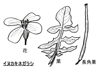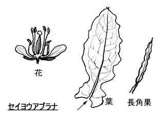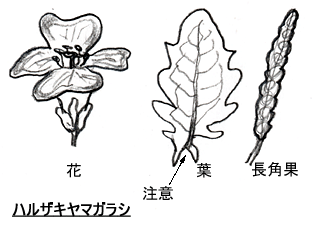 花(模式図)は,おしべのうち4本が長く,外側の2本が短い.茎の上の方の葉は耳状で茎をだくように付く.下の方の葉は翼状になり長い柄がある.茎,葉ともに白い粉をまぶしたように見える. |