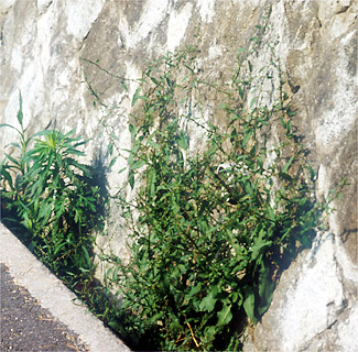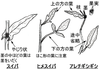 ※ここの三つは,花のついた枝の出し方がたがいによく似ていますので,かりにスイバのなかまとしておきます.その区別は葉のようすに注意します. |