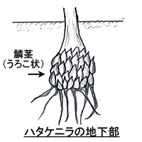 北アメリカからの帰化種で近ごろ市街地のいたるところで見るようになりました(写真112)。ニラの名をつけていますが、料理につかうニラの臭いは全くありません。地下にはうろこ状の鱗形(りんけい)がたくさんでき、それでなかまをふやします。庭にはいると退治するのがひと苦労で、害草扱いされています。