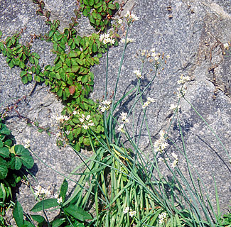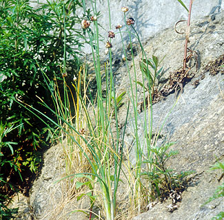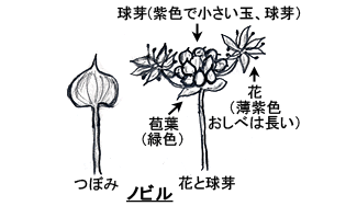 石垣のあいだからにょきにょきと生えてきました。郊外なら土手や道ばたでよく見ます(写真114)。タマネギ、ネギ、ニラ、ラッキョウ、ニンニクなどと同じように食欲をそそるにおい、味があり、球茎を掘り出して食べる人もあります。茎のてっぺんには球芽(きゅうがといって、花粉のやりとりなしでなかまをふやす細胞が発達した小さな玉)が集まって、そのまわりに花が咲いています。