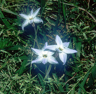 南アメリカ原産の鑑賞植物ですがハタケニラと同じようなふえ方で野生化しています(写真113)。花びらのような花被片(かひへん)は6枚、おしべの数は6本というぐあいに、ユリ科のなかまでは3の倍数のしくみがあります。