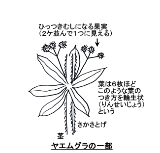 歩道わきのヒラドツツジの植えこみに、もたれかかるようにして群がり生えるヤエムグラ(写真128)。この草はひとり立ちできません。それで、四角い茎に生えたたくさんのとげでまわりのものに引っかかって体を支えます。また、丸い実にもとげが多く、手を引っかいたり、服にくっついたりして、ムギ畑の草とり、ムギ刈りの仕事を手伝っていた少年のころの私を困らせました。