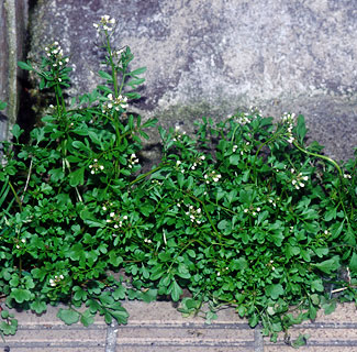 オオバタネツケバナはふつう流れのある水辺に生えるのですが、ここは古くからある市場のなかの豆腐屋さんの軒下で、水を使うことの多い場所がらでしょうか。小さな溝に生き生きとした緑を生やしていました。