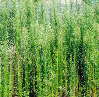 震災後の空き地などで大いに広がっているのは、北米産のヒメムカシヨモギです(写真246)。ほっそりして背高く、ぎっしりと生えています。このヒメムカシヨモギは大群落をつくりやすい植物のひとつです。まれに茎の上の方に小枝をたくさん出しているように見えるのが、オオアレチノギクです。