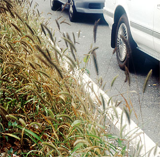 太短い尾っぽ状の穂に密生した毛がフィルター(filter)の役目をし、車の排気ガスに含まれるススをひっかけて、まるで墨(すみ)をつけた筆のようになっています。