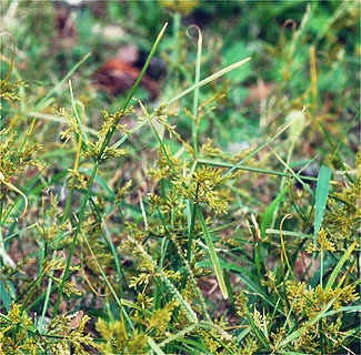 ハマスゲとよく似ていますが、穂のつき方が違います。こちらは1年草で、地下茎もありませんので、たやすく引き抜くことができ、ひげ根だけです(写真279)。